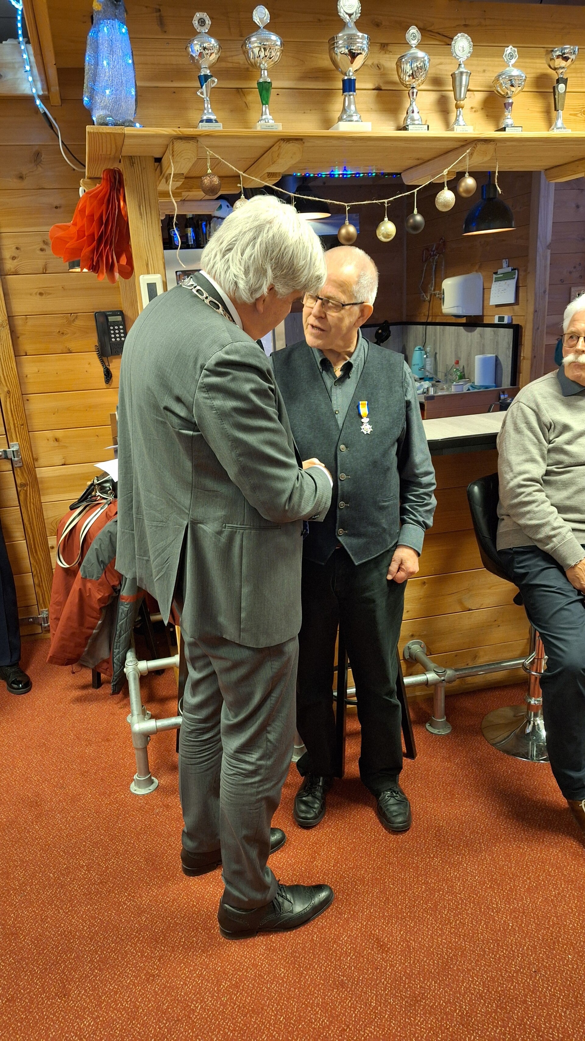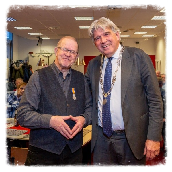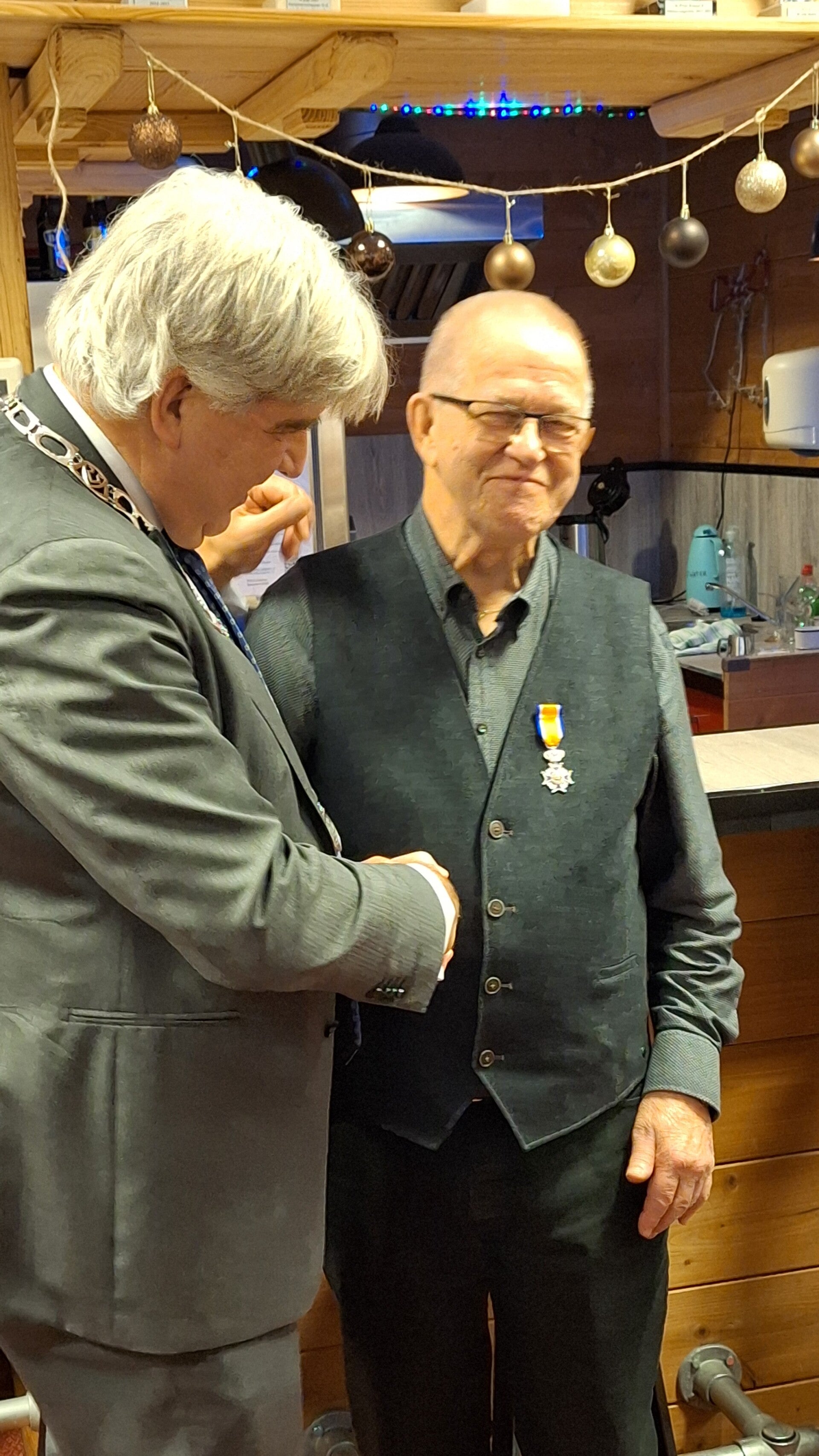 Constant schrok hier zichtbaar van en nadat de Hr. Jeager uitgebreid de reden van zijn bezoek had verteld, namelijk het uitreiken van een Koninklijke Onderscheiding, werd hierna ook overgegaan tot het opspelden van de onderscheiding.
